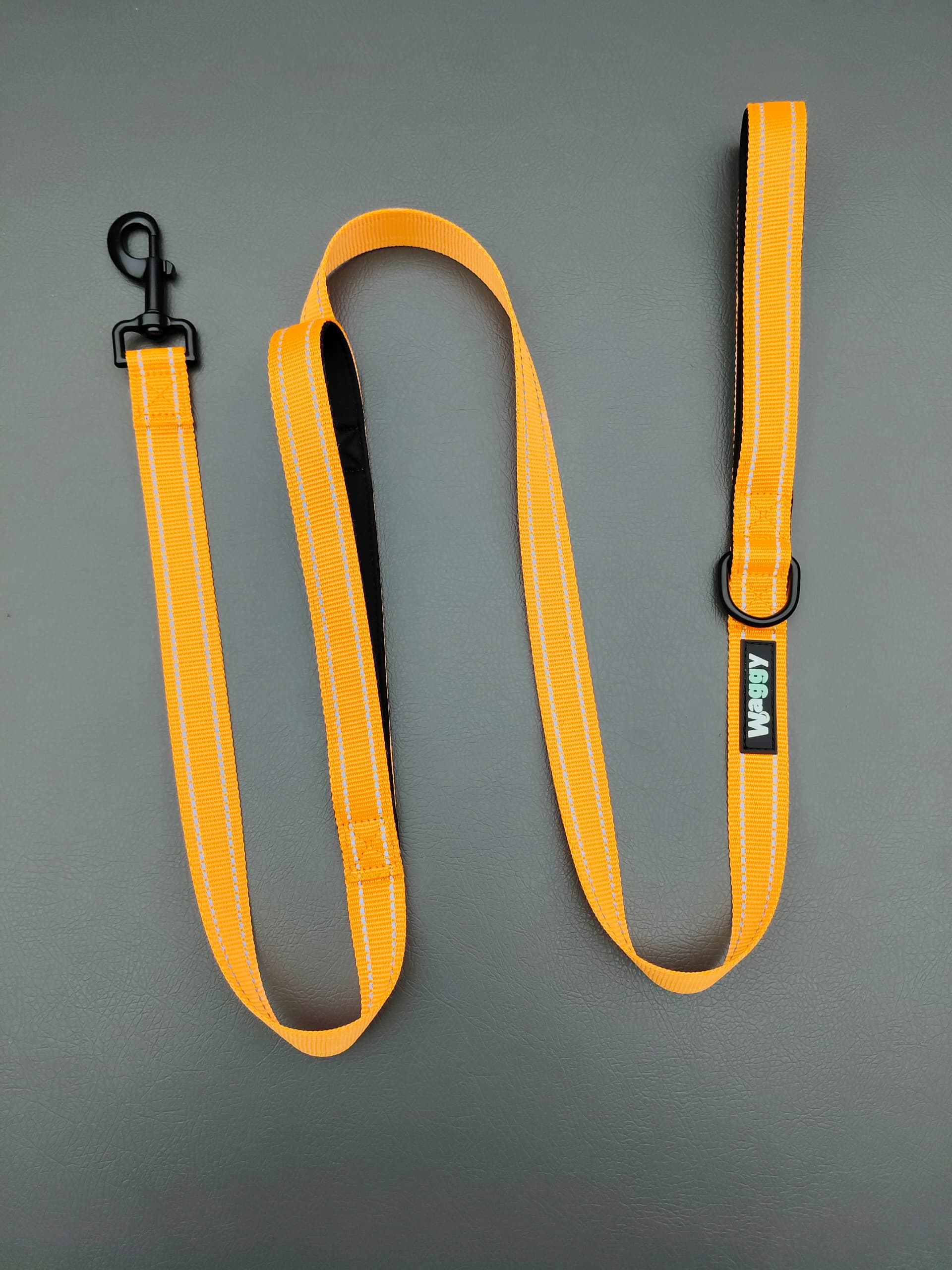 Correa reflectante de poliéster con cintas reflectantes para mayor visibilidad. Herrajes de aleación negra, anillo D de aleación y gancho de neopreno con logo de caucho. Diseñada para paseos seguros de día y de noche.